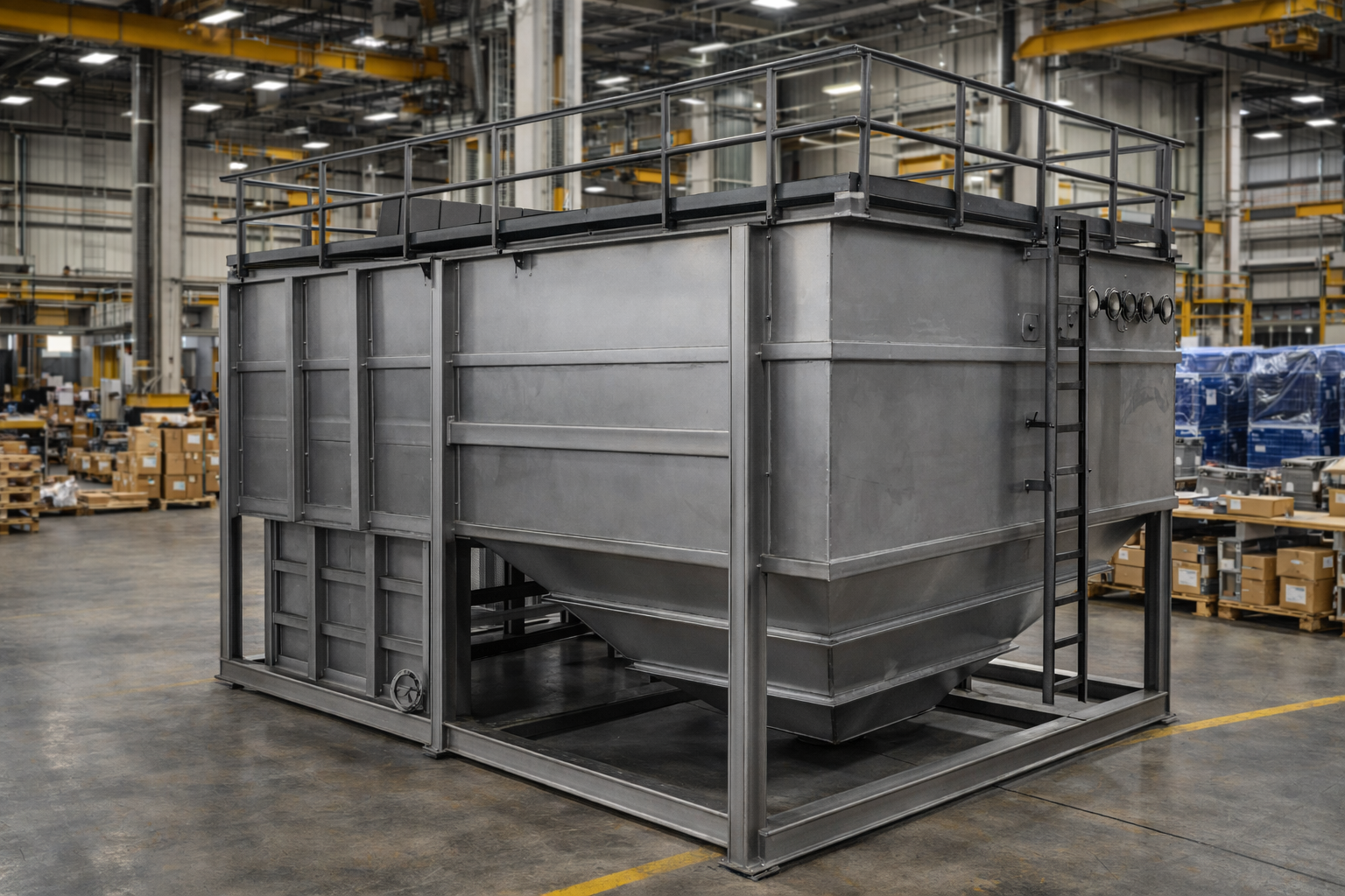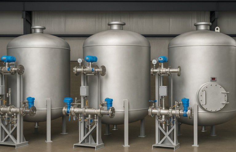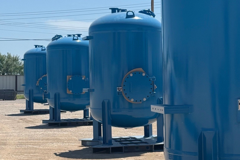 All tanks and vessels are produced in-house from start to finish, including CAD design, plate rolling, welding, hydrotesting, internal coating, and final assembly.